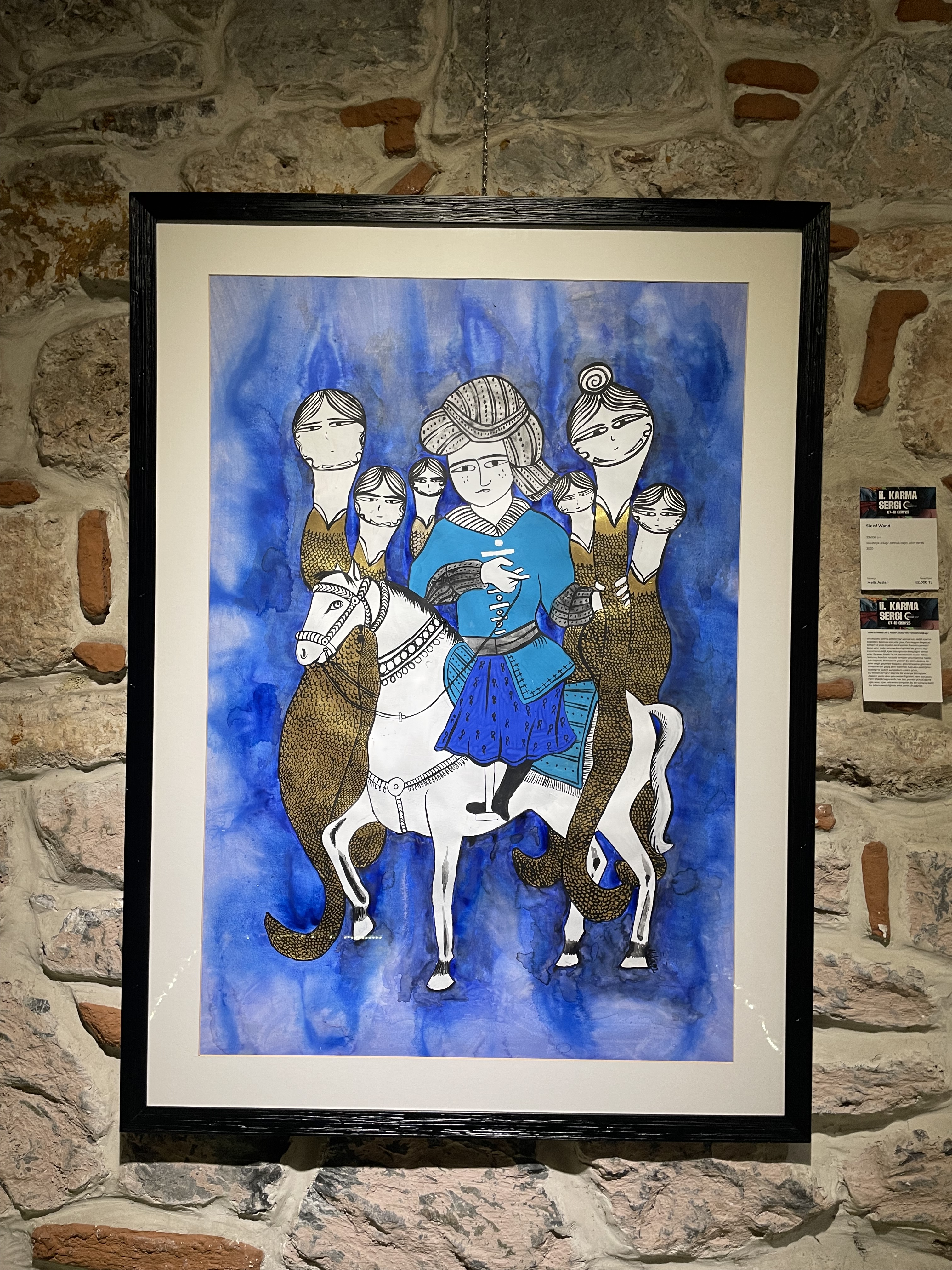 Bu eser, klasik Tarot destesindeki Asalar Altılısı kartının, Anadolu ruhuyla yeniden yorumlanmış halidir. Suluboya ve altın tarakla yapılan bu çizim, sadece bir zafer değil; geçmişle bugünü, görünmeyenle görüneni birleştiren bir geçiş anını betimler.